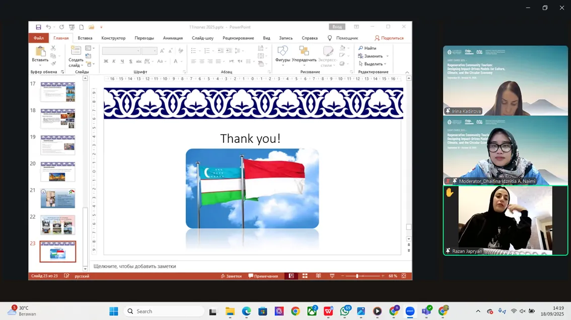 Materi untuk sesi keempat Short Course Summer 2025 disampaikan oleh Kadirova Irina Vladimirovna selaku Kepala Departemen Pendidikan Global di Silk Road International University of Tourism and Cultural Heritage dan dimoderatori oleh Dhaifina Idznitia. Kadirova membahas tentang Keberlanjutan Budaya dan Warisan Takbenda dalam Pariwisata Regeneratif dengan studi kasus Samarkand. Hal pertama yang disampaikan adalah mengenai Silk Road. Silk Road adalah Universitas Internasional pariwisata dan warisan budaya di mana mereka melatih spesialis di bidang pariwisata dalam berbagai area seperti logistik, manajemen, warisan budaya, arkeologi, dan museologi.